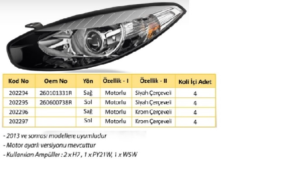 AYFA202294 FAR SAG SIYAH CERCEVELI RENAULT FLUENCE MERCEKLI ( 2013 ) 260101331R AYFAR XAYFA202294 8682811701158 2022944